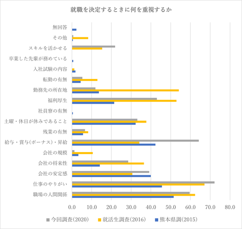 同じ質問をした3つの調査があります。いずれも就職を決定するときに重視するものを4つ以内回答しなさいという設問になっています。